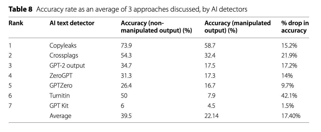 O cenário base já é assustador. Quando o texto gerado por IA não foi manipulado, a precisão média dos detectores foi de apenas 39,5%.