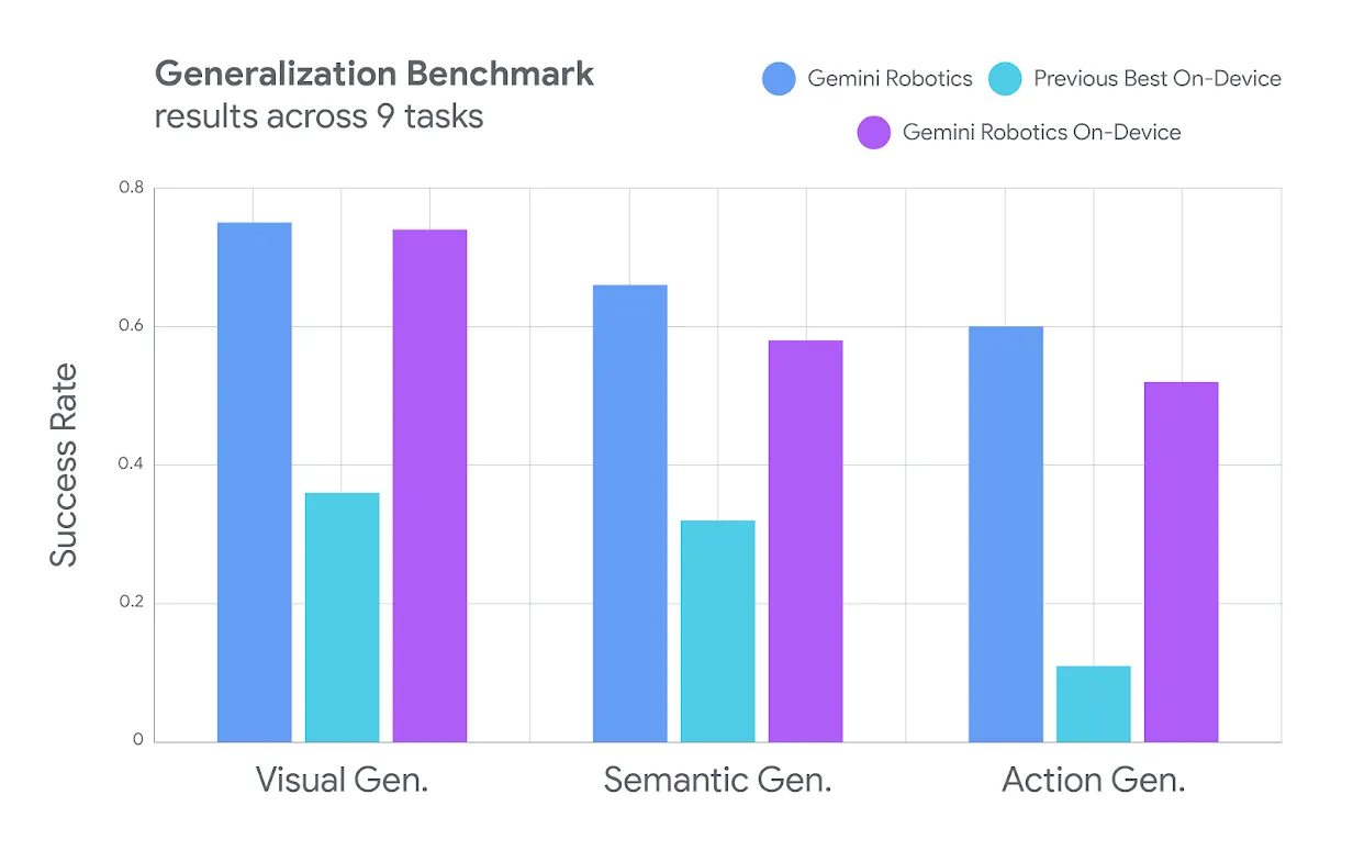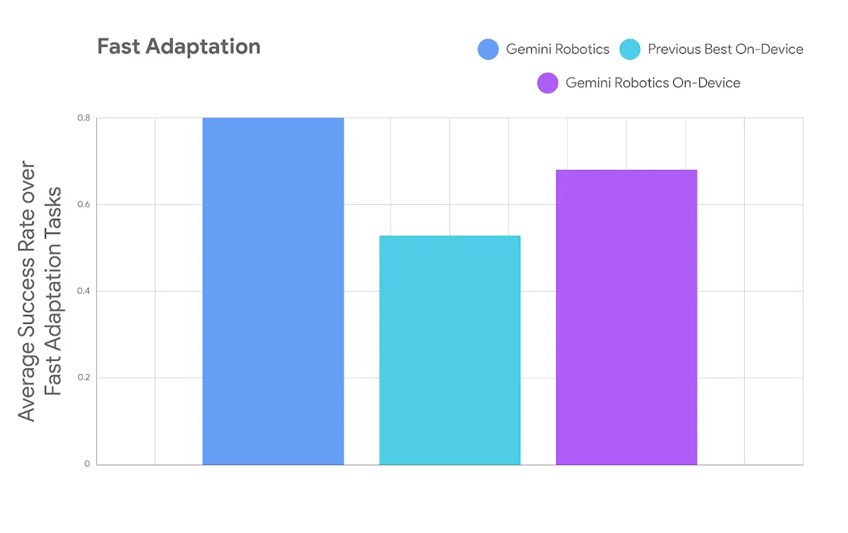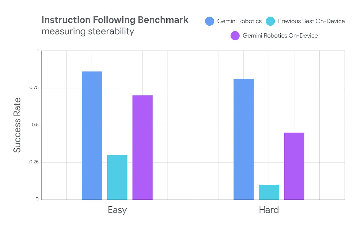 - Generalização robusta: O Gemini Robotics On-Device demonstra forte generalização visual, semântica e comportamental. Ele pode seguir instruções em linguagem natural e executar tarefas complexas mesmo em cenários nunca vistos antes (fora da distribuição) e com instruções de múltiplos passos. Isso é um diferencial importante, pois muitos modelos de IA têm dificuldades em lidar com situações inesperadas.
