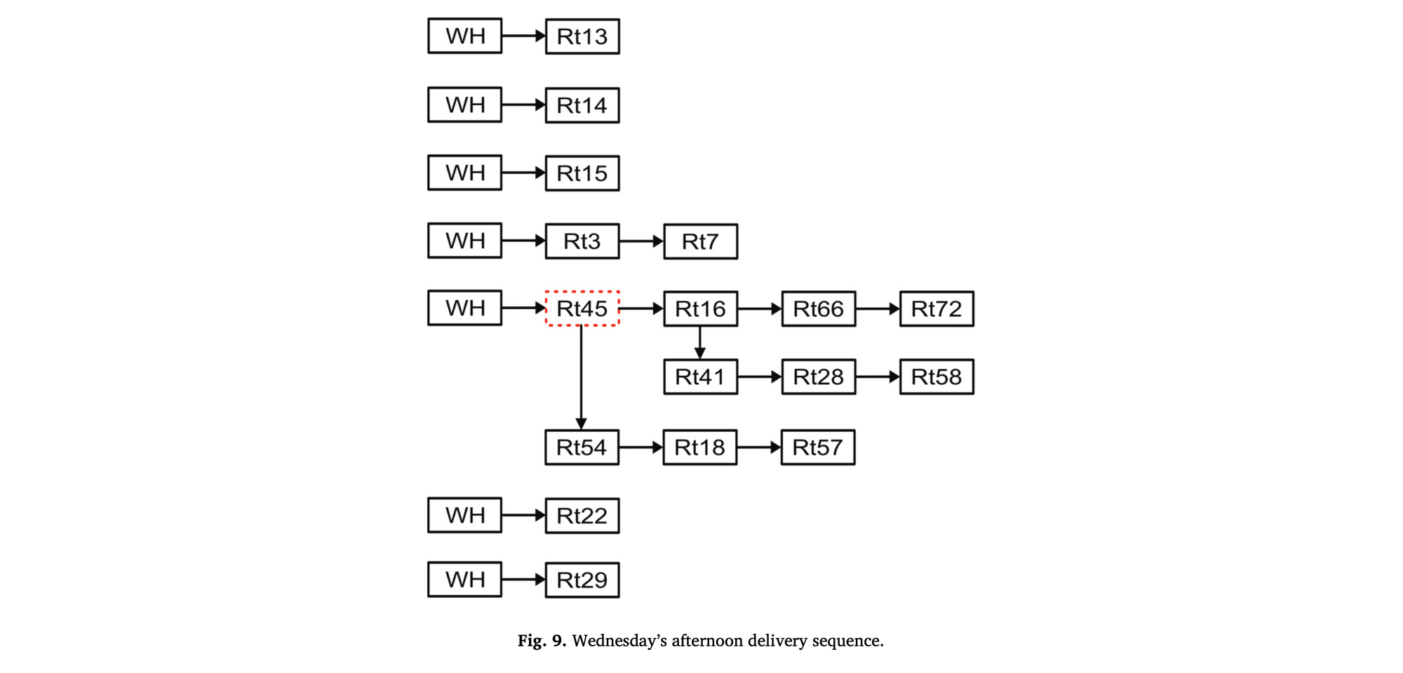 - Entregas em cadeia (Multi-Sink): Um caminhão não sai do armazém, entrega em um único varejista e volta. Isso seria um desperdício. O modelo otimiza rotas contínuas, onde um veículo visita múltiplos varejistas em sequência. A figura 9 do artigo ilustra isso perfeitamente. Vemos rotas onde um caminhão sai do armazém (WH), vai para o varejista Rt45, de lá para o Rt16, e do Rt16 se divide para atender outros varejistas como Rt66 e Rt41. Isso é o caixeiro viajante com esteroides.
