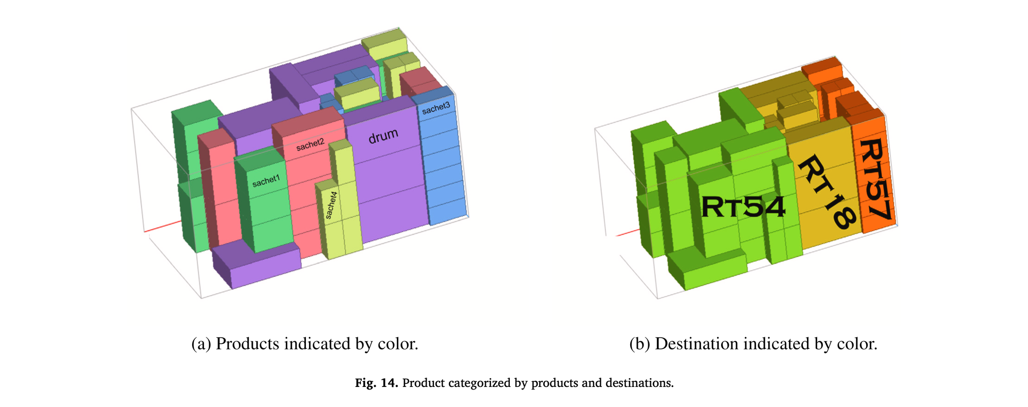 - Otimização de Carregamento: Não basta definir a rota, é preciso carregar o caminhão de forma inteligente. Se você vai visitar os varejistas A, B e C, nessa ordem, os produtos para o varejista C devem ser carregados primeiro (no fundo do caminhão), e os do varejista A por último (perto da porta). O estudo foi além e usou um software chamado PackVol para otimizar o empacotamento físico da carga, garantindo que o descarregamento fosse eficiente. A Figura 14 mostra essa visão, com a carga colorida por produto e por destino, uma visualização fantástica do resultado prático da otimização.