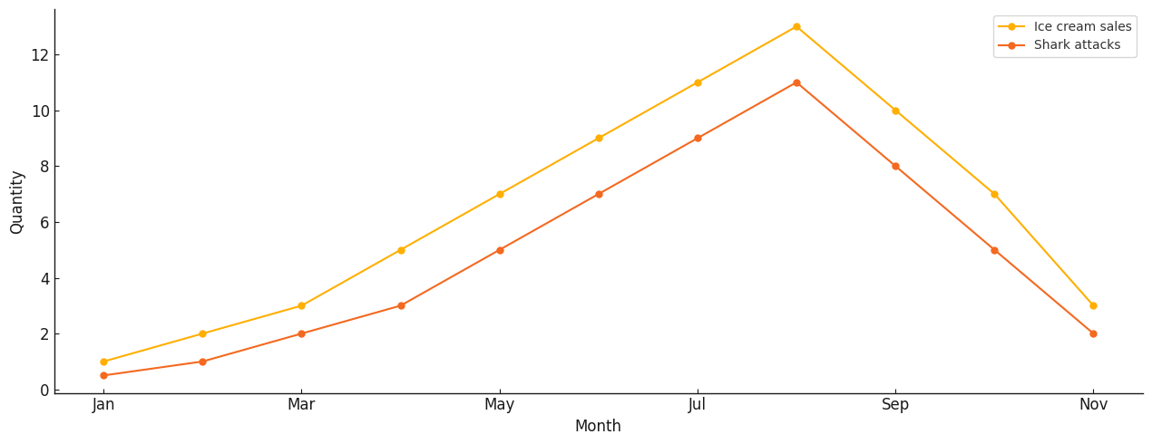 O exemplo clássico é o das vendas de sorvete e dos ataques de tubarões. Se você olhar os dados, vai ver que os dois sobem e descem juntos. Uma IA baseada em correlação poderia concluir que, para reduzir os ataques de tubarões, deveríamos proibir a venda de sorvetes. Uma conclusão estúpida, claro, porque ela ignorou a causa comum: o calor. É o sol e o calor que fazem as pessoas comprarem mais sorvete E irem mais à praia, o que aumenta a chance de ataques de tubarão.